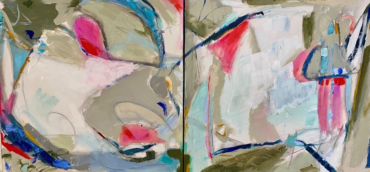 This 24X48 ( two 24x24 paintings) is shown as a diptych, each painting will stand on its own also. This is a nonobjective painting with a large range of tonality. This piece has strong straight lines of deeper colors that hold you in the paintings. There is also a strong pull by the curvilinear that cradles hidden treasures. There are red shapes that seem to smile back at you.