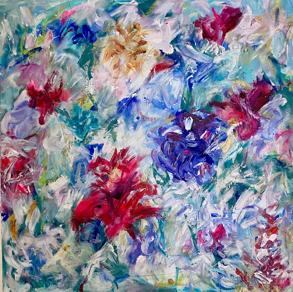 This piece is a 20x20. As a child and throughout my life my Mom has always had a flower garden. The flowers were always calling to me. I can remember all the stages of the flowers from budding then showing each delicate petal reaching up to the sky, then hiding during the winter. I would day dream the flowers were alive and we talked while having a picnic. Then as an adult I would always visit my Mom during the spring to help her in the garden while the flowers were blooming. These paintings are done with the feeling of daydreaming with the wind gently blowing as the petals are opening. Mom’s Garden paintings are done bright vibrant colors.