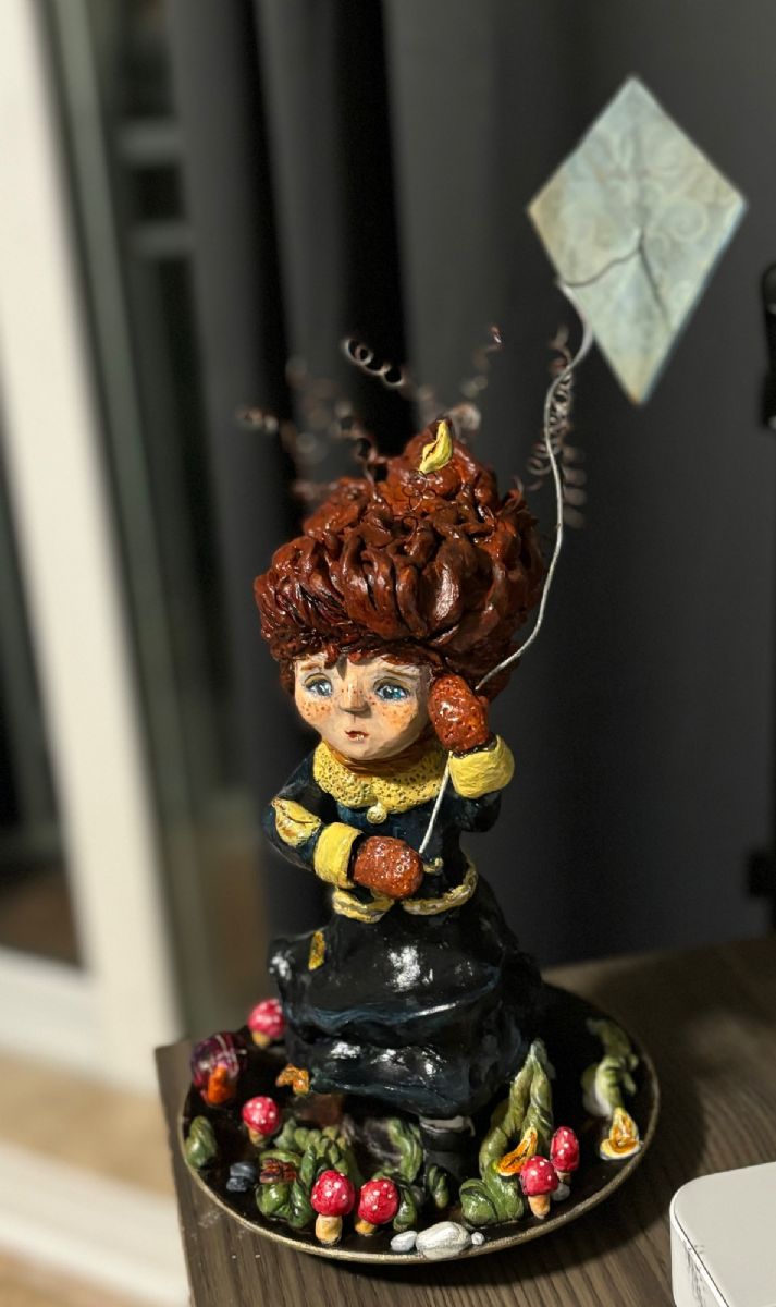This sculpture started out as a candlestick that I deconstructed and sat there twisting and turning it until I saw a scarf blowing in the wind. I built an armature out of foil and then covered that will layers of epoxy clay. She evolved in my hands. I love that process in sculpting. I envisioned her running through a field in autumn with leaves blowing past as she attempts to get her kite airborne. Her auburn hair is my favorite part. Thick tendrils trailing behind her in wild abandonment. I love this piece because she created herself in my hands.