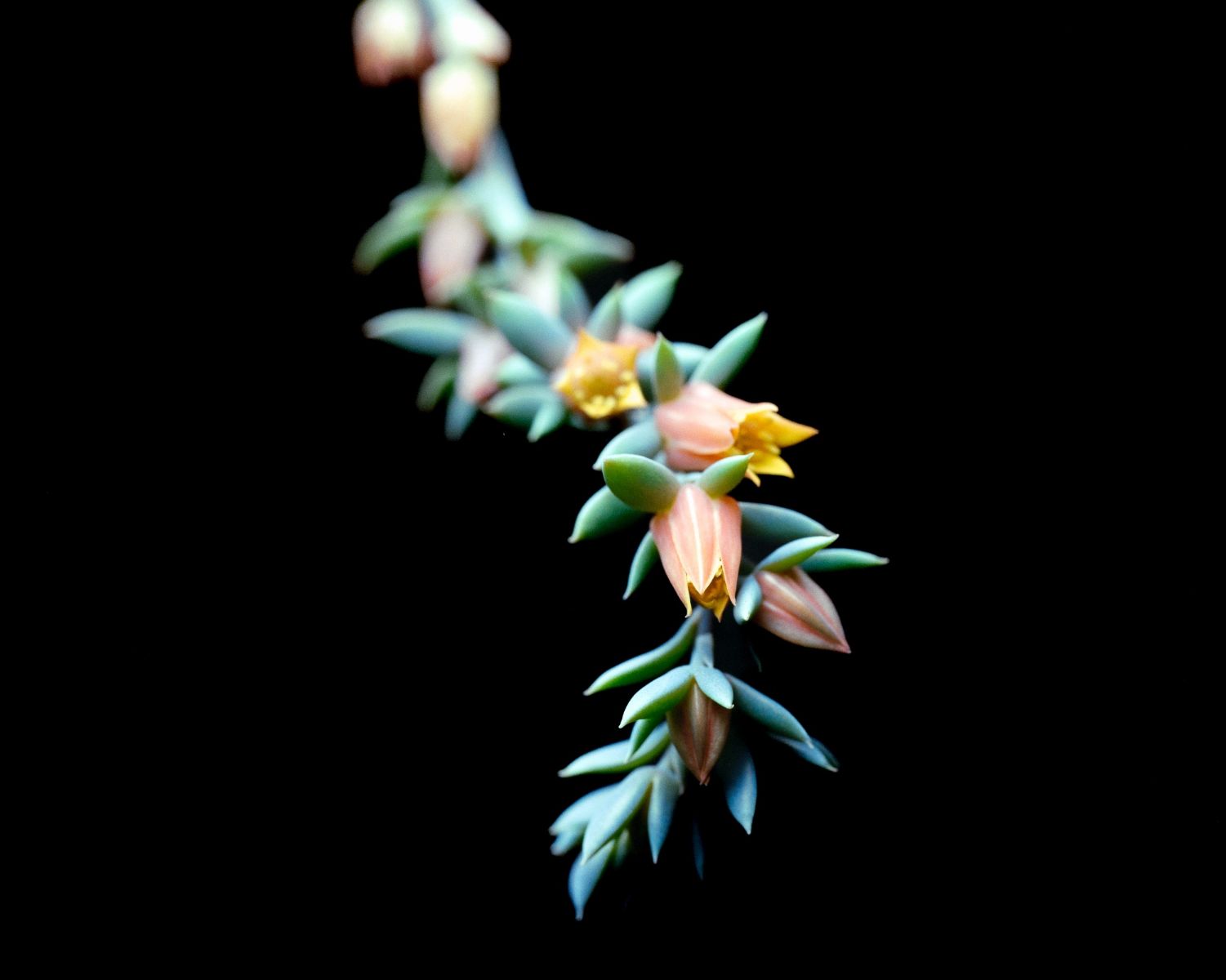 The Echeveria 'Dusty Rose' Succulent gets its name from is rose colored leafs. Every year, this plant creates these long, drooping flower stalks with these dusty teal green petals that compliment the salmon colored flowers that are yellow inside. These flowers are tiny, about half the size of a dime. I love the pastel colors with the pop of yellow. The stalk continuous grows longer as the flowers on the shorter end begin to wilt.