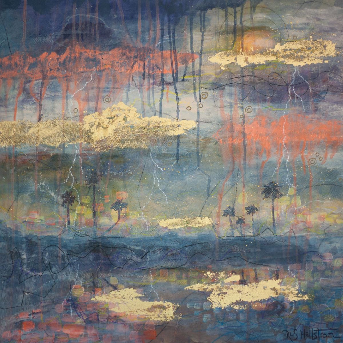 Touches of gold foiling are catching the light and adding an ethereal glow that breaks through the stormy darkness. These shimmering accents highlight the turbulent clouds and create a mesmerizing interplay between light and shadow, infusing the scene with a touch of warmth. The painting captures the raw energy of nature, inviting viewers to delve into the beauty found in the heart of a storm.