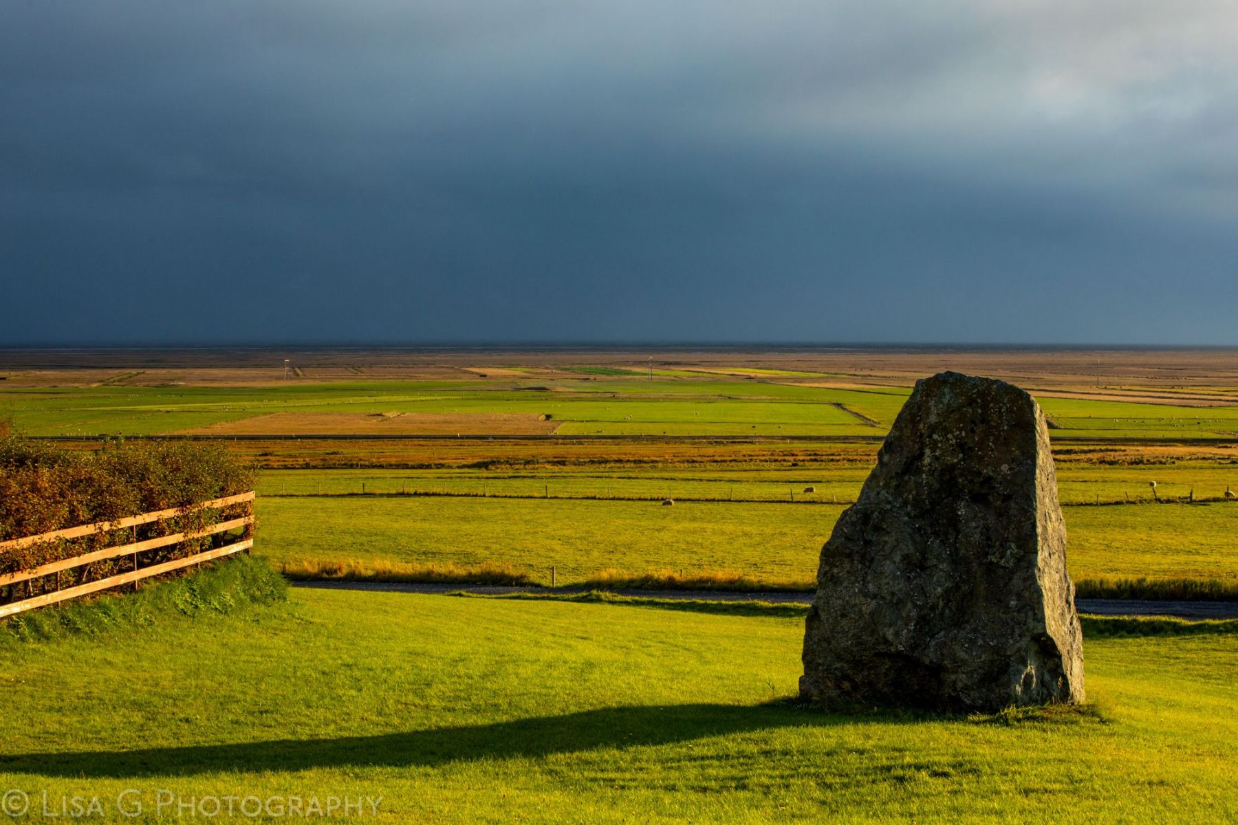 In the early autumn in Iceland, endless fields of green and gold roll into the ocean, and giant boulders like this monolith can be seen scattered about the landscape; left behind by receded glaciers.
