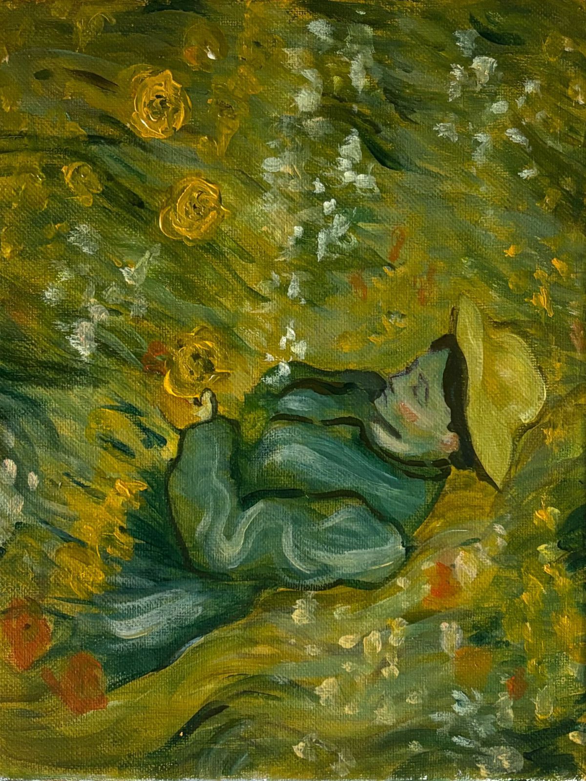 Tribute to Van Gogh was the first in my Van Gogh series. The colors are reminiscent of his style during a darker period. The woman was inspired by one of his peasant women. The mood is somber and I envisioned her picking his sunflowers and mourning his tragic life.
