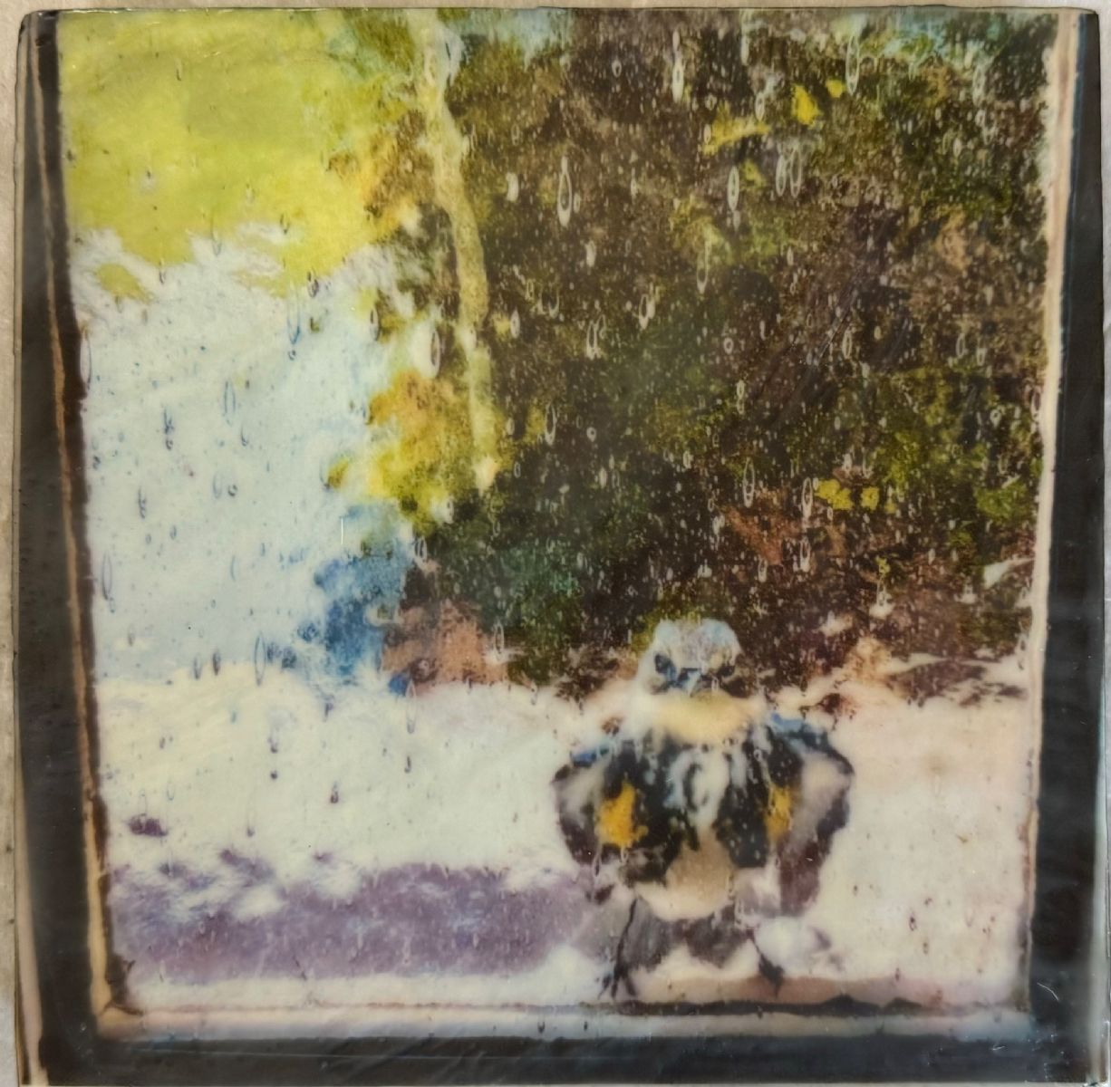 This little guy was outside my door, adamant that to be let him in! The photo was layered with molten beeswax and pigments, a durable coat of natural materials for this little beauty of nature.
