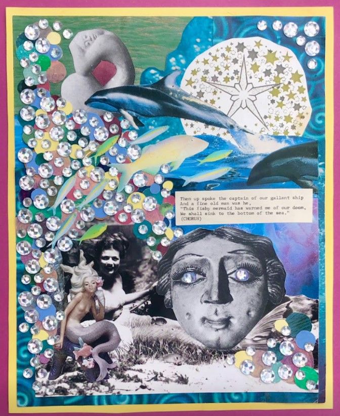MYSTERIES OF THE OCEAN imagines a dreamy sea-scape that is home to mystical mermaids and their friends. Mermaids may be associated with love, beauty and magic- alternatively, they are sometimes considered omen of bad luck, exemplified by an excerpt from a folk song about an old sailor who received a warning of forthcoming peril from a mermaid. The sparkling "bubbles" bring an element of kitsch and playfulness to the work, balancing out the slightly macabre implications of the lyrics.