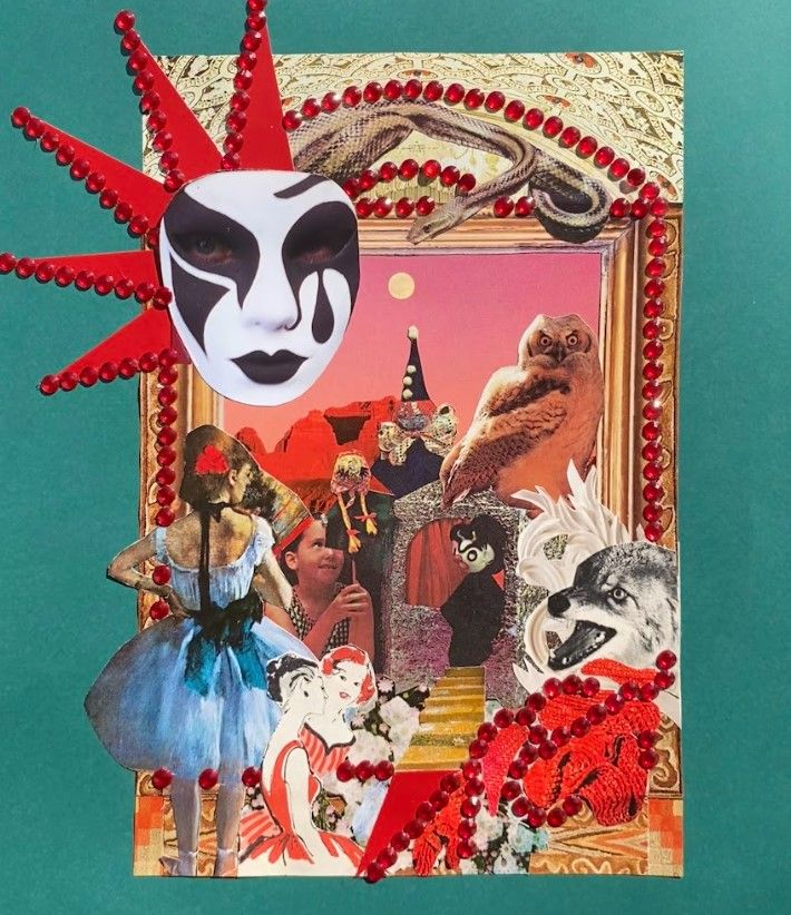 PIERROT'S PARTY presents the viewer with a window into a magical world outside of our own that emerges as the sun sets and day transitions to night. While the Pierrot is traditionally a somber character, here he is envisioned as the mysterious ringleader of a mischievous party attended by an ensemble of night-dwellers. My intentions with this work was to create a simple, balanced composition featuring a set of characters that invite the onlooker to envision what activities might take place within and create their own story.