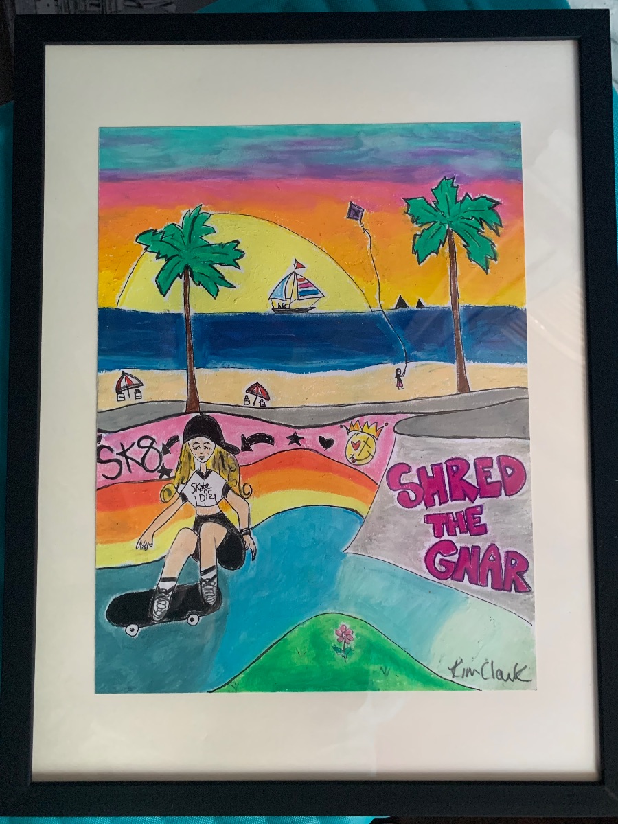 Hey, Babe Let’s Skate, is inspired by all the fun I’ve been having learning how to become a better skateboarder, and how amazing it is to share that time with others. It’s a 9x12 oil pastel illustration, in a 12x16 shatterproof frame with white mat. Skateboard Art