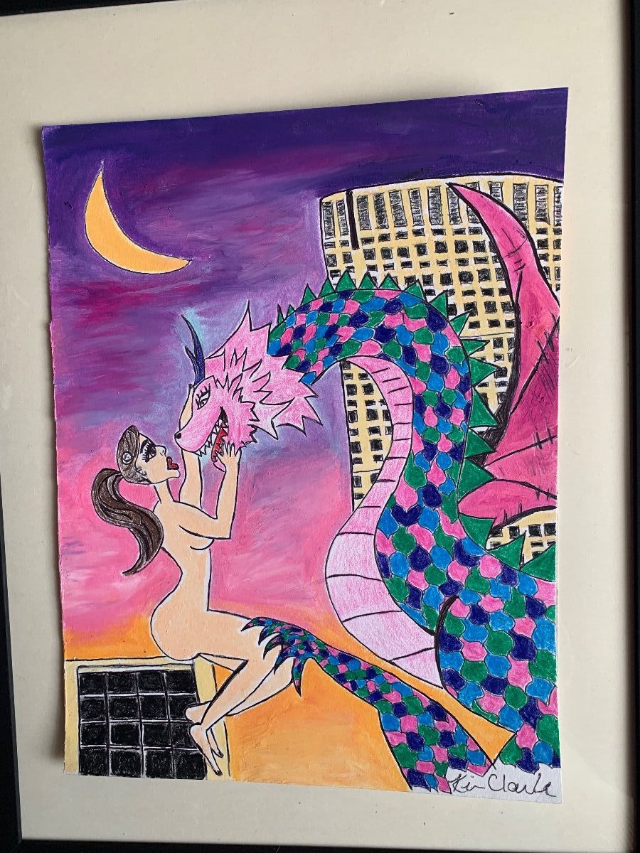 Dragon Skies is a fantasy piece inspired from all my fun performances this year with the Aerial Dragons in Tampa. It’s a 12x9 oil pastel and color pencil illustration. It’s in a 16x12 black frame with white mat.