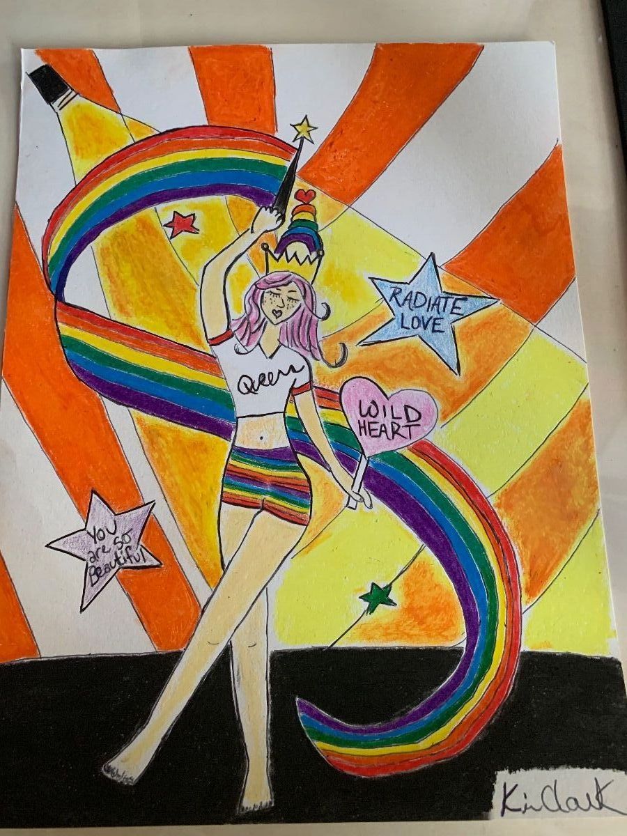 Wild Heart is a fun piece created with extra love in celebration of Pride Month. It’s a 9x12 illustration in ink, color pencil, and oil pastel, and is in a black shatterproof frame with white mat.