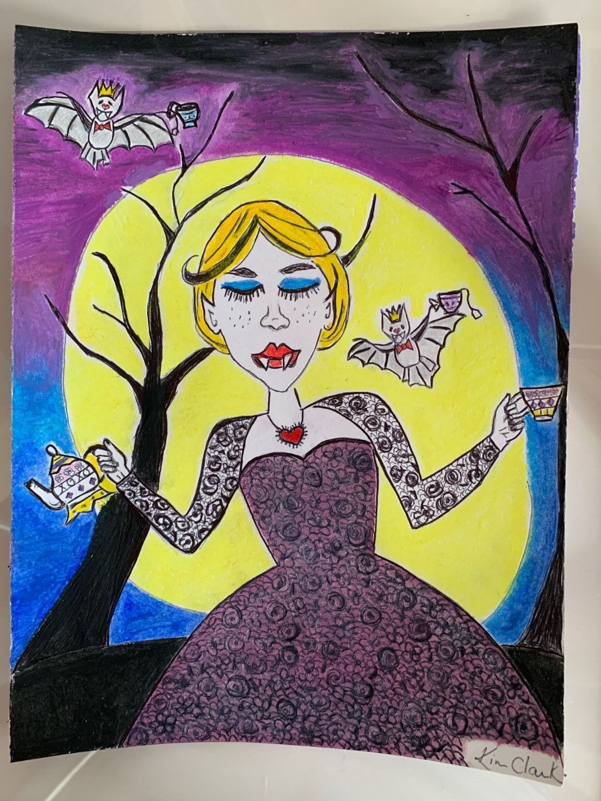 Moonlight Tea for 3 is inspired by the eternal love of a vampires heart, and also for the love of tea with friends! This is such a special piece to me , and I was so happy to create it for A Vampire Tea Party at Midnight. Its a 9x12 oil pastel, ink, and colored pencil illustration , that comes in a black 12x16 frame with white mat.