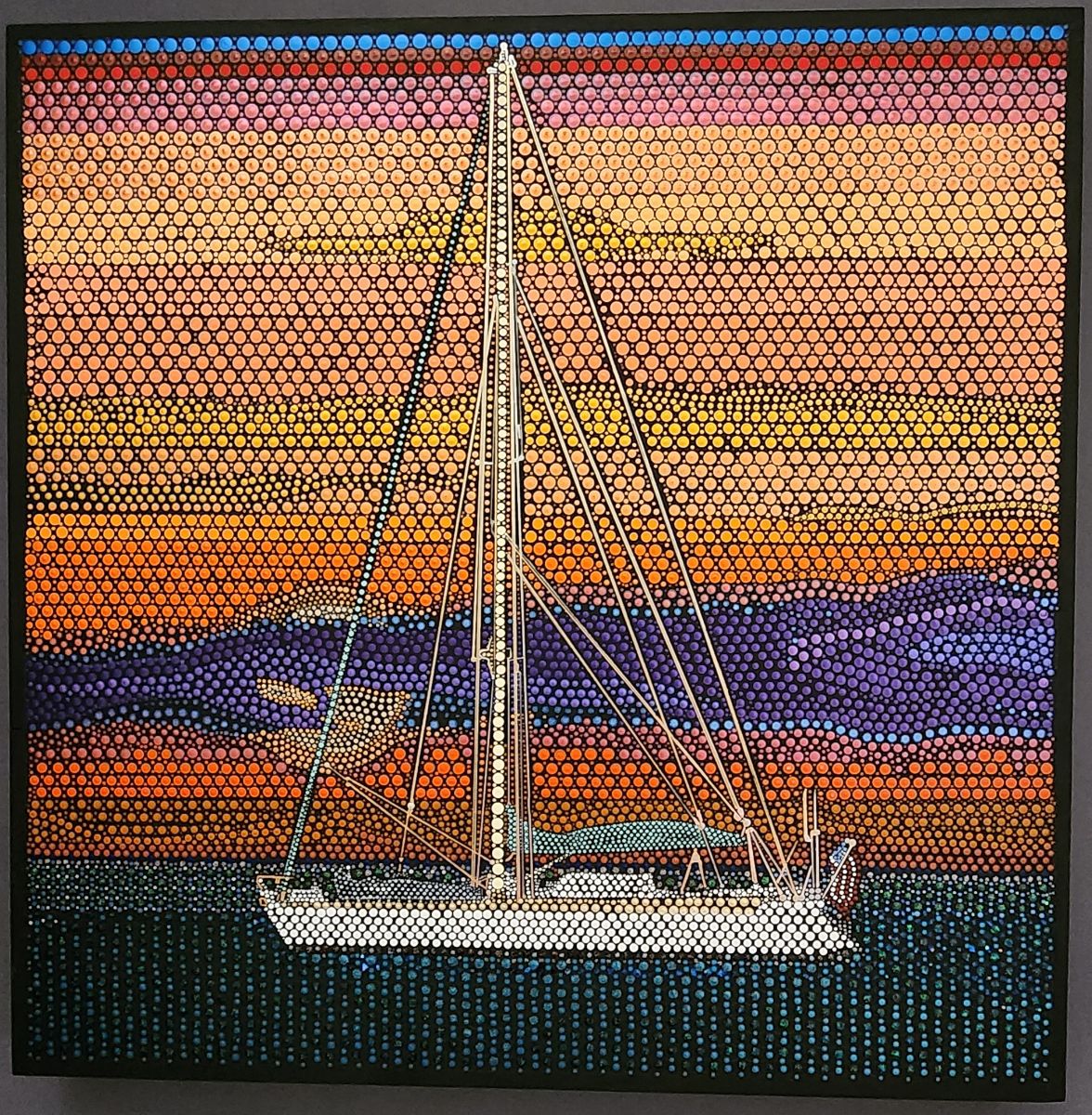 This is one of my favorite sailboats. My style is called "Tooled Pointillism". I use dotting tools to apply acrylic paint. It has been painted onto a wood box panel, of museum quality. No kit of any kind has been used. I draw and dot my paintings and each one is an original.