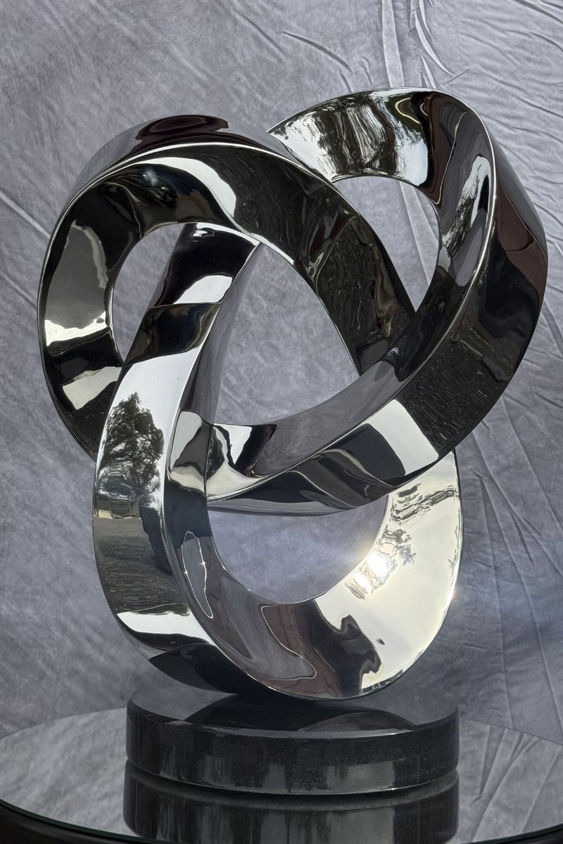 Circo is a trefoil Möbius sculpture now reimagined in gleaming stainless steel. The name—Italian for “circus” or “ring”—reflects both its continuous form and playful energy. Originally carved in calcite, the piece was later scanned and cast after the original was damaged. This new stainless edition brings a crisp, contemporary presence to the design. Its polished surface catches and bends light, amplifying every twist and curve. The form loops seamlessly, full of rhythm and tension, like a performer in motion.