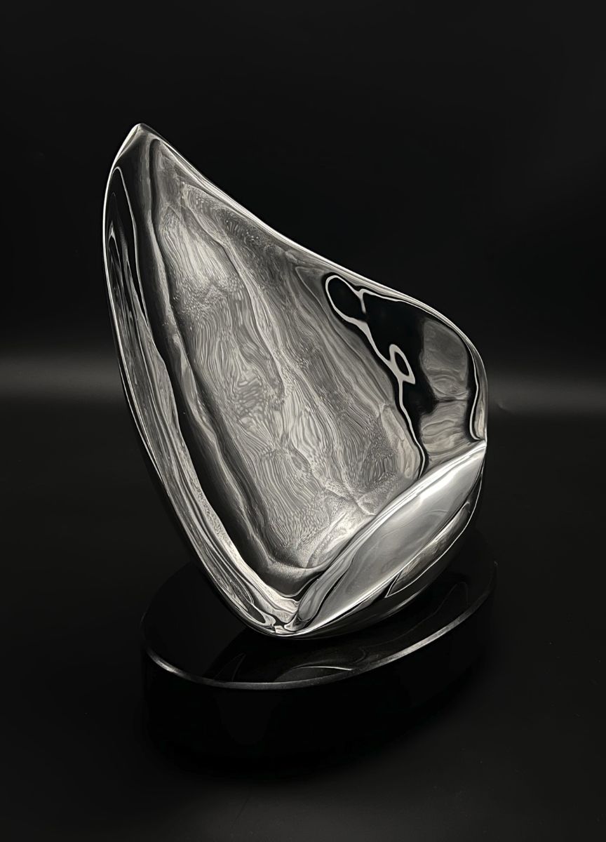 This quicksilver sculpture, initially crafted in Carrara marble, captures the essence of a sailboat with its sleek, thin form. The original stone piece was purchased by a collector with a deep connection to sailing. This new Windan, made of stainless steel, embodies fluidity and the graceful motion of waves. The name derives from the Germanic verb “Windan’ meaning to wind, turn, and twist, and it captures the potential to navigate stormy seas with grace and agility.