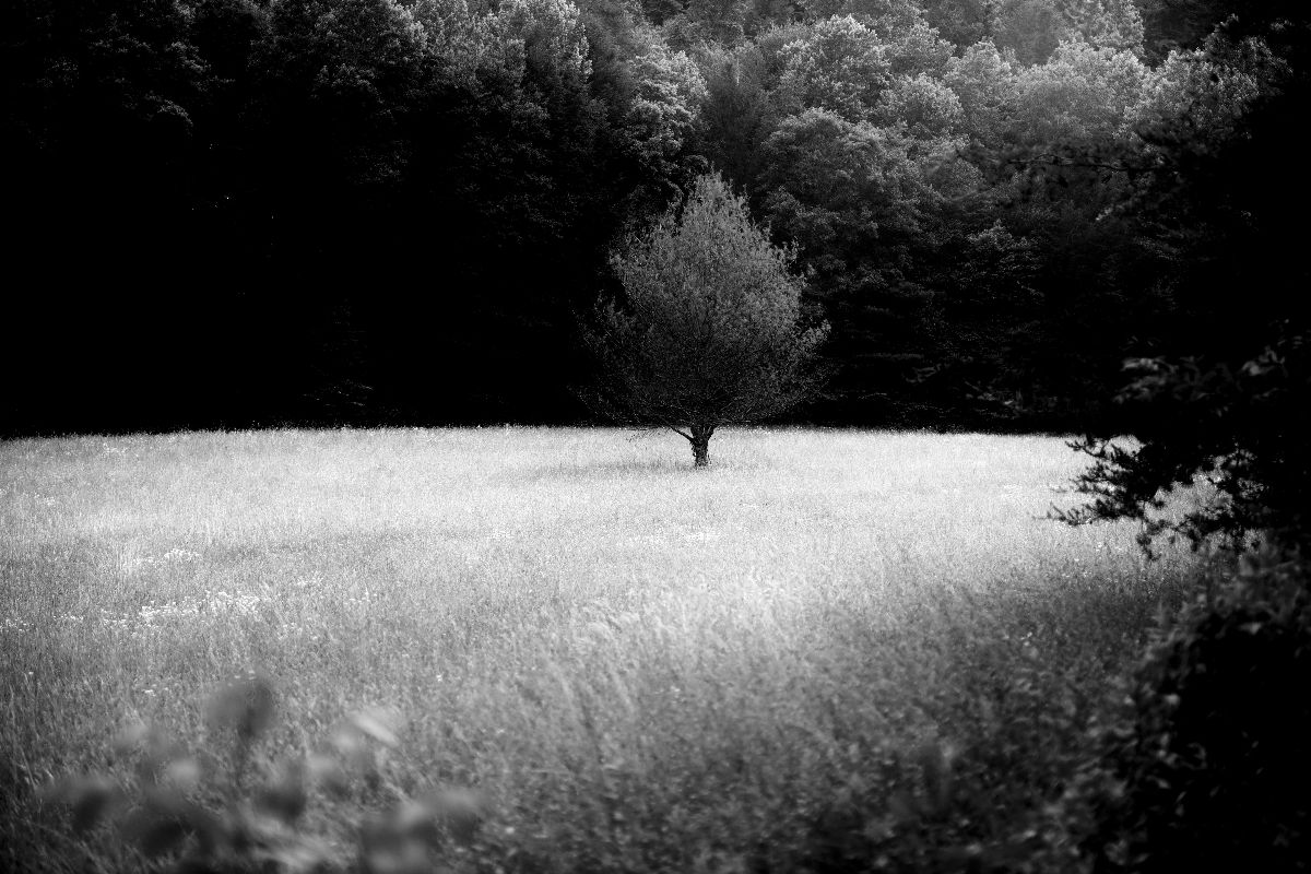 My friend Annie calls this the "Happy Tree", and so it is. Driving down a country road, I saw it standing bravely, all alone. As I worked on the photo, I accented the darkness surrounding it, and the light emanating below it. In our uncertain world, the dark forest looms large, but the little tree is unafraid. As we try to be.